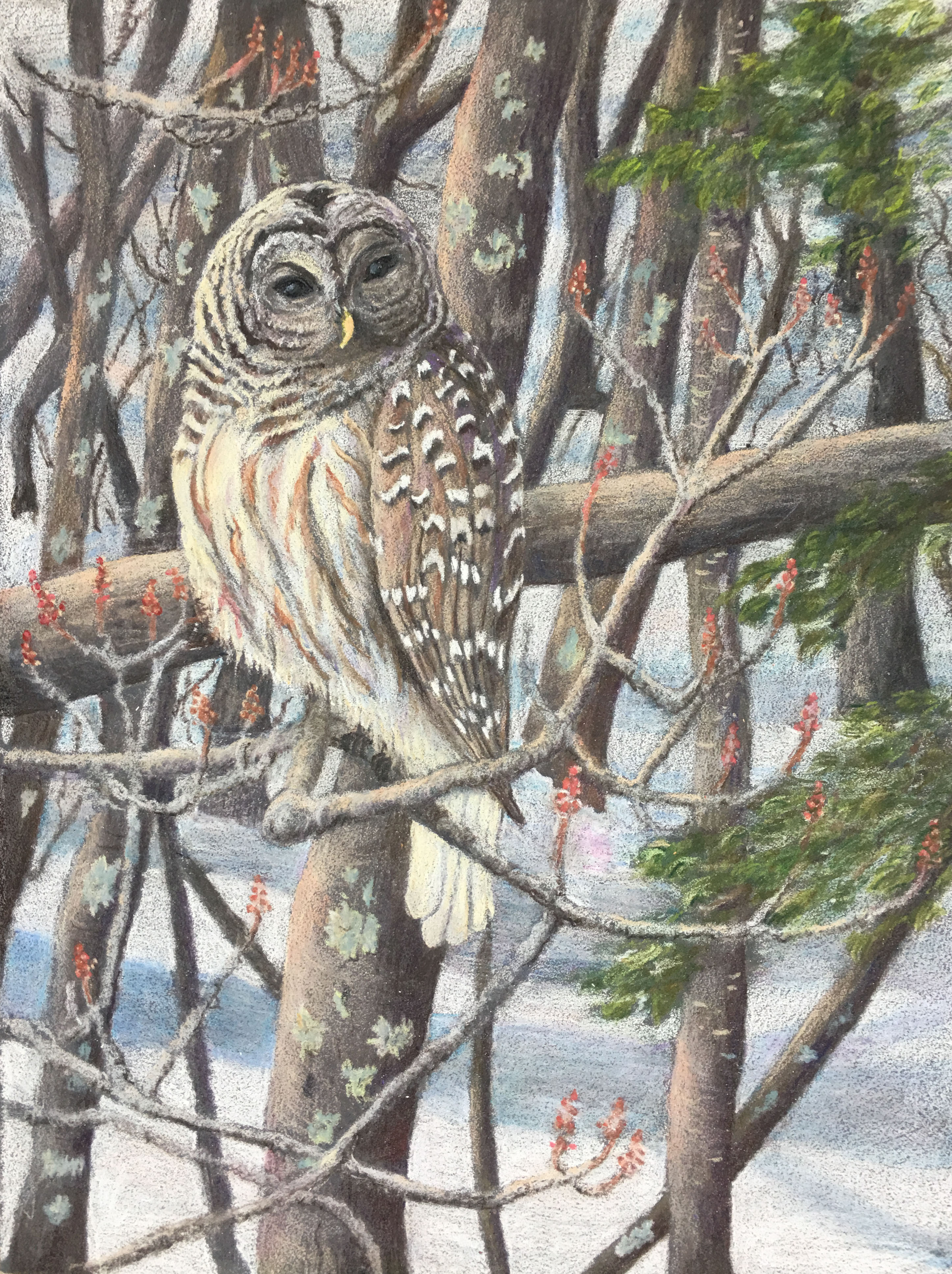 “Owl in Snow”, Colored Pencils